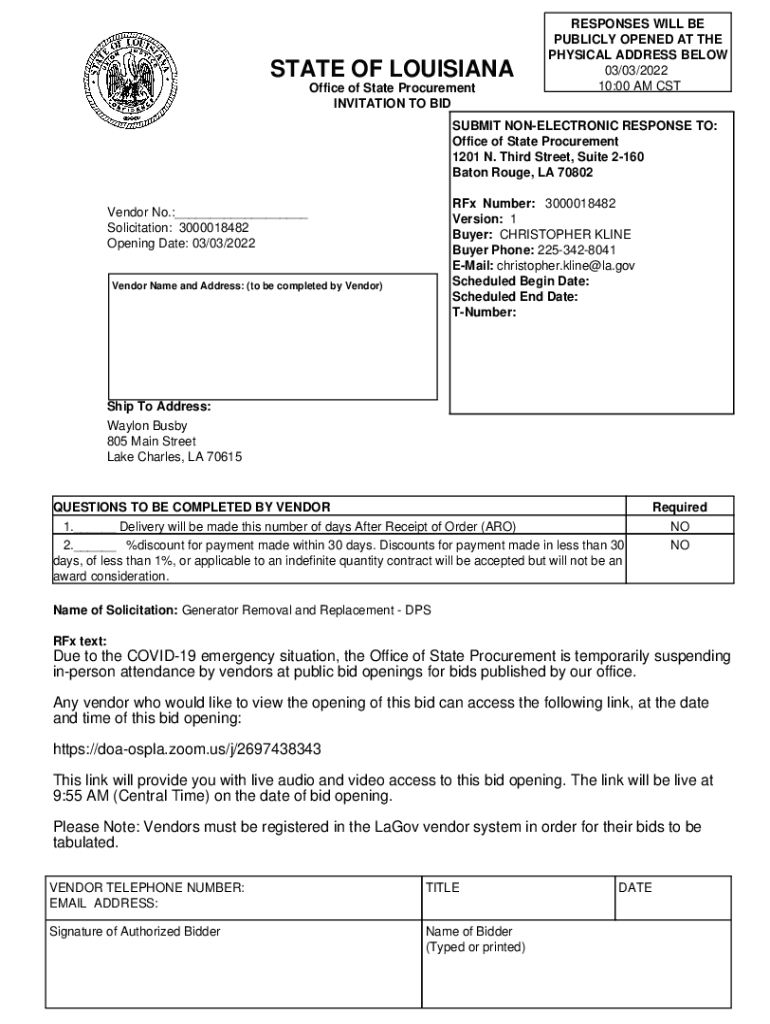 STATE OF LOUISIANA Office of State Procurement INVITATION TO RESPONSES WILL BE PUBLICLY OPENED AT THE PHYSICAL ADDRESS BELOW 03/03/2022 10:00 AM SUBMIT NONELECTRIC RESPONSE TO: Office of State Procurement