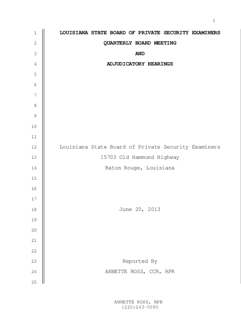 1 1LOUISIANA STATE BOARD OF PRIVATE SECURITY EXAMINERS2QUARTERLY BOARD MEETING3AND4ADJUDICATORY HEARINGS5 6 7 8 9 10 11 12Louisiana State Board of Private Security Examiners1315703 Old Hammond Highway14Baton