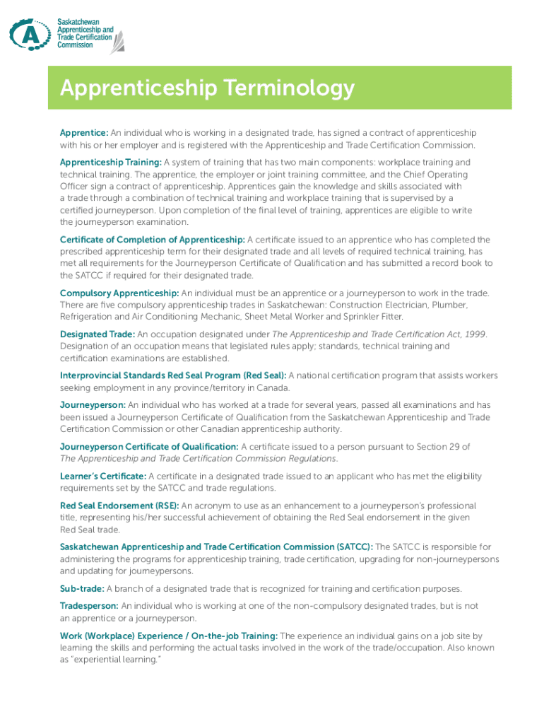 Apprenticeship Terminology Apprentice: An individual who is working in a designated trade, has signed a contract of apprenticeship with his or her employer and is registered with the Apprenticeship