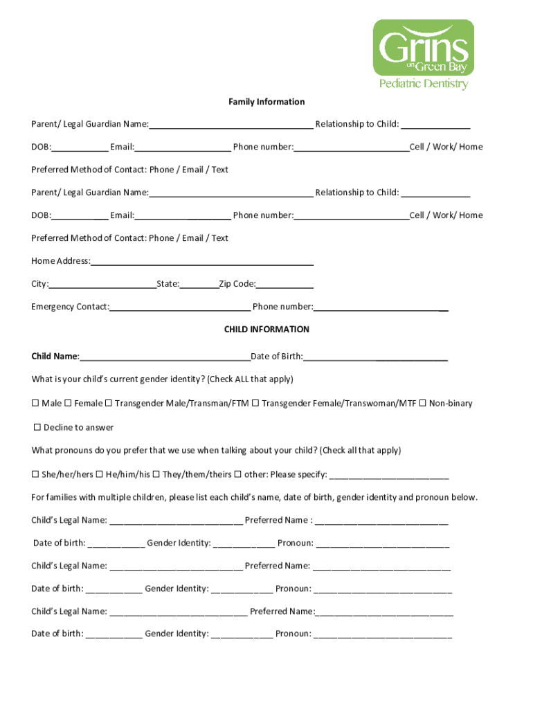 Family Information Parent/ Legal Guardian Name: DOB:Relationship to Child:___ Email:___ Phone number:Cell / Work/ HomePreferred Method of Contact: Phone / Email / Text Parent/ Legal Guardian Name: