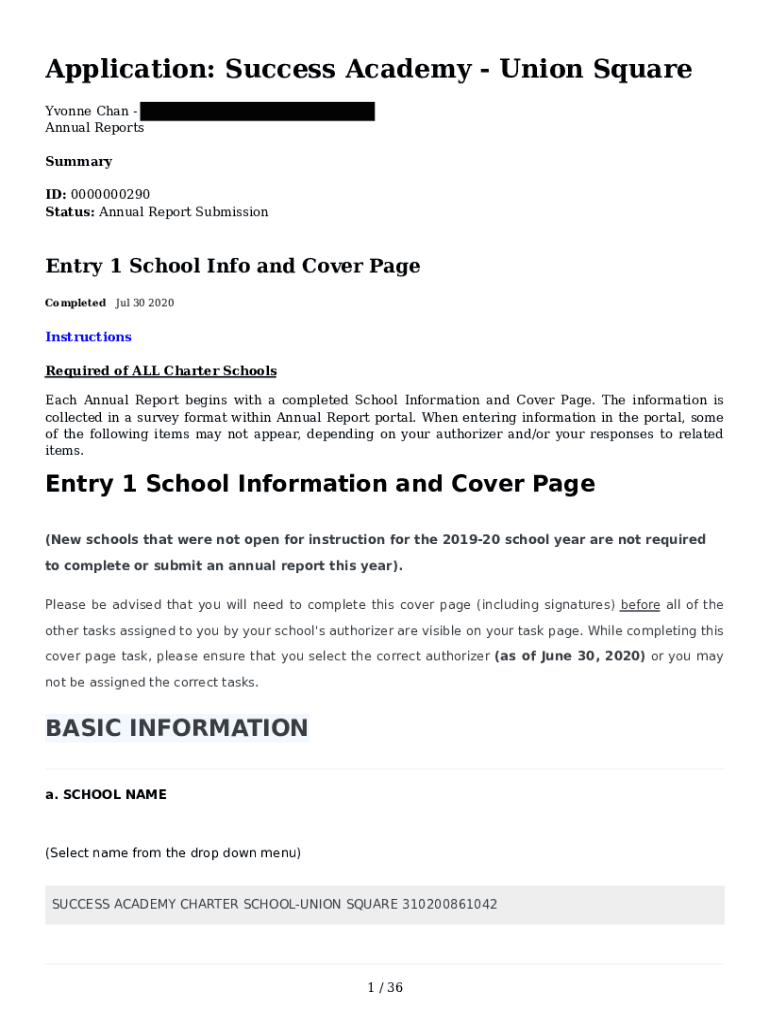 Application: Success Academy Union Square Yvonne Chan Annual Reports Summary ID: 0000000290 Status: Annual Report SubmissionEntry 1 School Info and Cover Page Completed Jul 30 2020Instructions Required