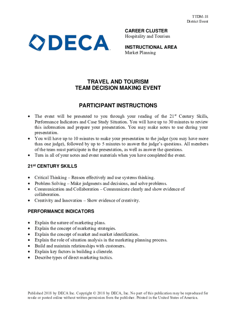 TTDM18 District EventCAREER CLUSTER Hospitality and Tourism INSTRUCTIONAL AREA Market PlanningTRAVEL AND TOURISM TEAM DECISION MAKING EVENT PARTICIPANT INSTRUCTIONS The event will be presented to