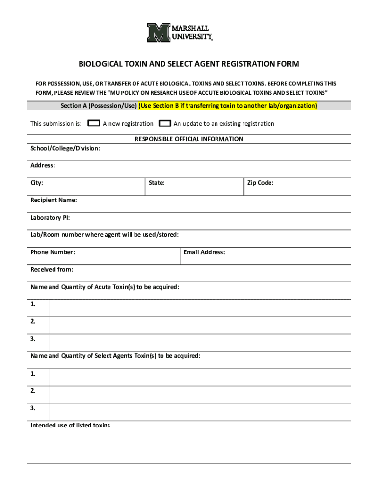 Get the free jcesom.marshall.edumedia57850BIOLOGICAL TOXIN AND SELECT AGENT REGISTRATION FORM