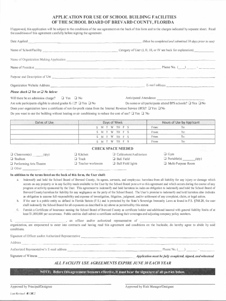 APPLICATION FOR USE OF SCHOOL BUILDING FACILITIES OF THE SCHOOL BOARD OF BREVARD COUNTY, FLORIDA If approved, this application will be subject to the conditions of the use agreement on the back of