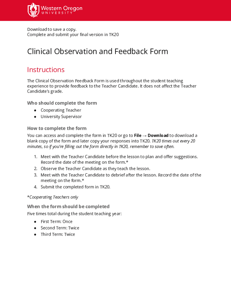Download to save a copy. Complete and submit your Neil version in TK20Clinical Observation and Feedback Form Instructions The Clinical Observation Feedback Form is used throughout the student teaching