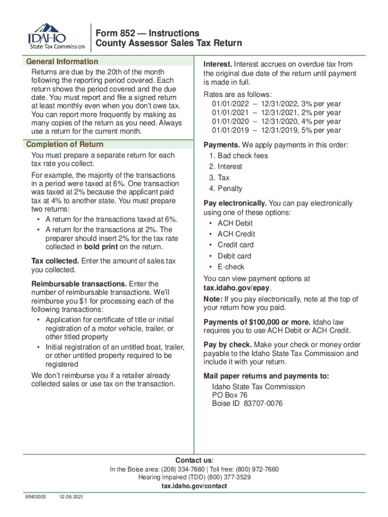 Get the free Form 852 Instructions, County Assessor Sales Tax Return approved - tax idaho
