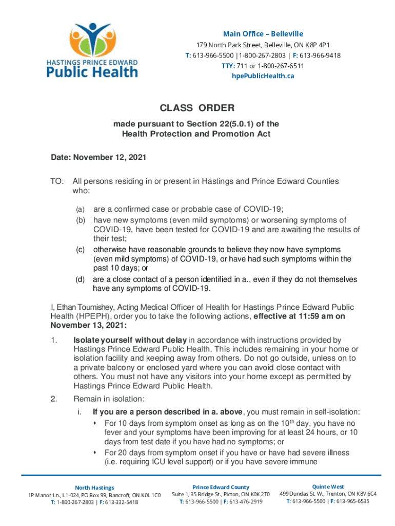 Main Office Belleville 179 North Park Street, Belleville, ON K8P 4P1 T: 6139665500 |18002672803 | F: 6139669418 TTY: 711 or 18002676511 hpePublicHealth. Class ORDER made pursuant to Section 22(5.0.1)