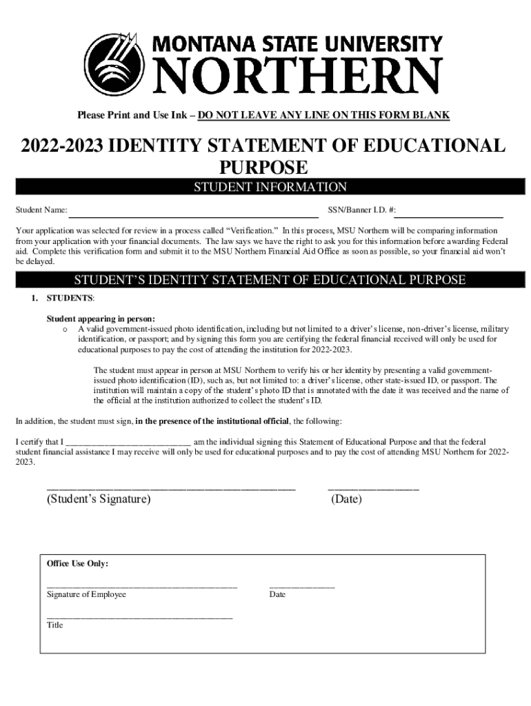 Please Print and Use Ink DO NOT LEAVE ANY LINE ON THIS FORM BLANK20222023 IDENTITY STATEMENT OF EDUCATIONAL PURPOSE STUDENT INFORMATION Student Name:SSN/Banner I.D. #:Your application was selected