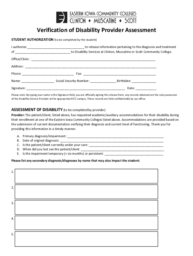 Verification of Disability Provider Assessment STUDENT AUTHORIZATION (to be completed by the student) I authorize ___ to release information pertaining to the diagnosis and treatment of ___ to Disability
