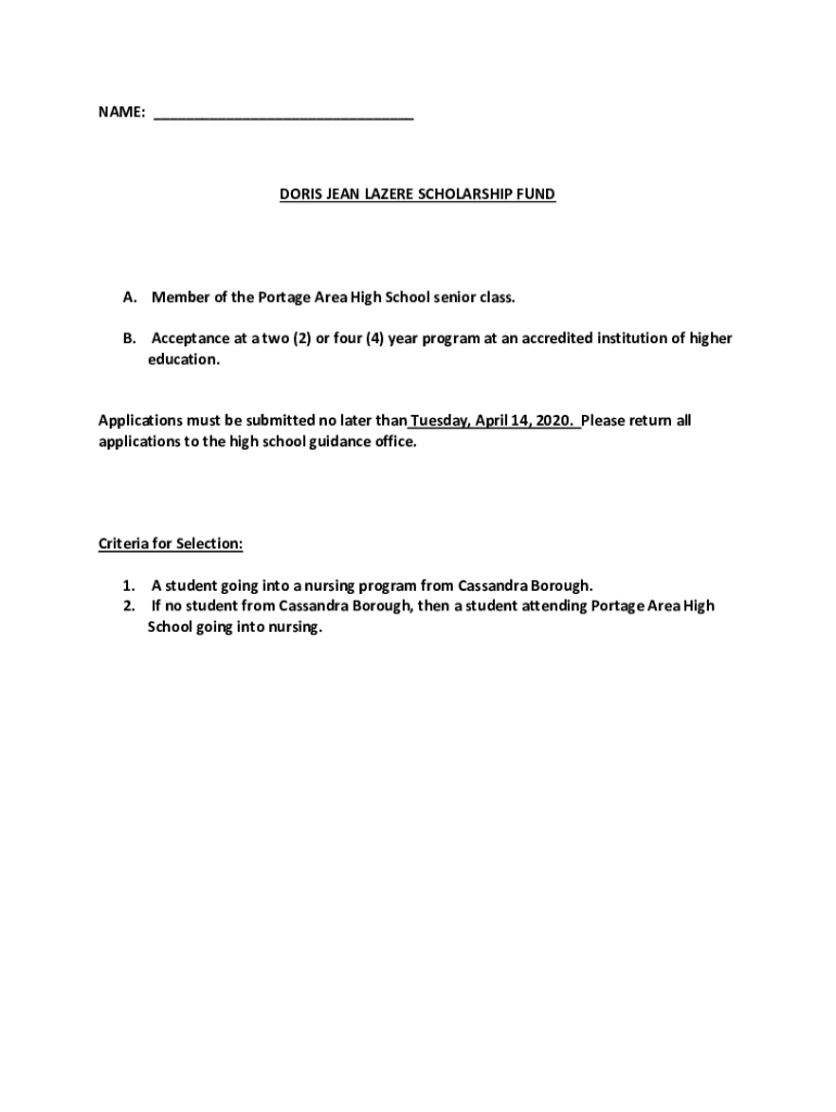 NAME: ___DORIS JEAN LAZE RE SCHOLARSHIP FUNDS. Member of the Portage Area High School senior class. B. Acceptance at a two (2) or four (4) year program at an accredited institution of higher education.