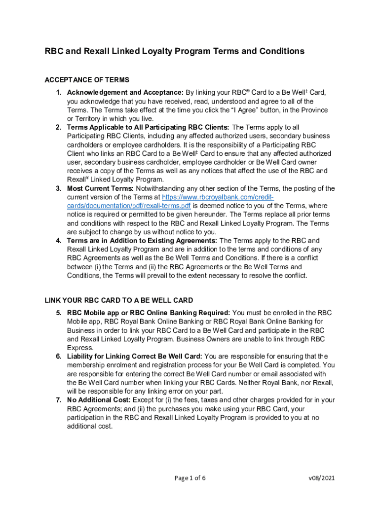 RBC and Recall Linked Loyalty Program Terms and Conditions ACCEPTANCE OF TERMS 1. Acknowledgement and Acceptance: By linking your RBC Card to a Be Well Card, you acknowledge that you have received,