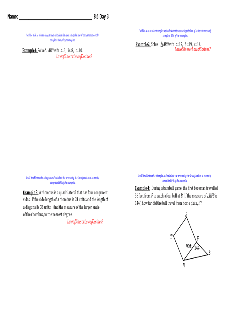 Name:___8.6Day3 Iwillbeabletosolvetrianglesandcalculatetheareausingthelawofcosinestocorrectly complete80%oftheexamples. Example1: Solve ABC with a5, b8, c10. LawofSinesorLawofCosines? Iwillbeabletosolvetrianglesandcalculatetheareausingthelawofcosinestocorrectly