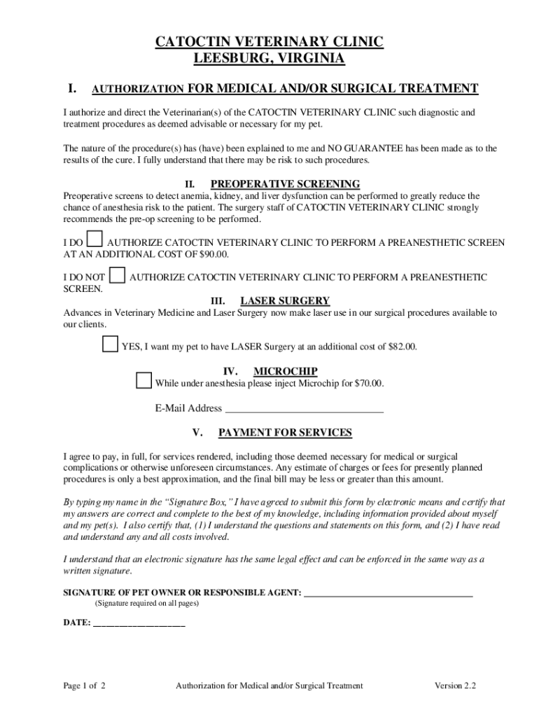 CATCHING VETERINARY CLINIC LEESBURG, VIRGINIA I.AUTHORIZATION FOR MEDICAL AND/OR SURGICAL TREATMENT authorize and direct the Veterinarian(s) of the CATCHING VETERINARY CLINIC such diagnostic and treatment