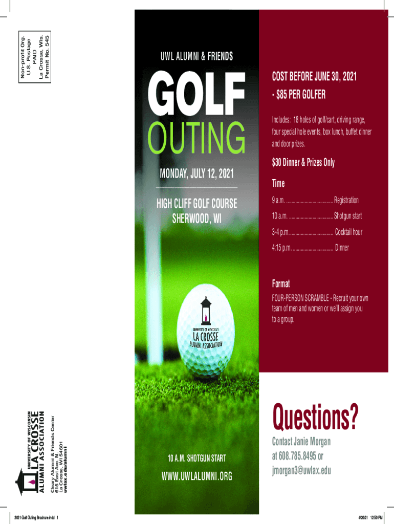 Nonprofit Org. U.S. Postage PAID La Crosse, Wis. Permit No. 545UWL ALUMNI & FRIENDSGOLFOUTING MONDAY, JULY 12, 2021 ___ HIGH CLIFF GOLF COURSE SHERWOOD, WIC OST BEFORE JUNE 30, $202185 PER GOLFERIncludes:
