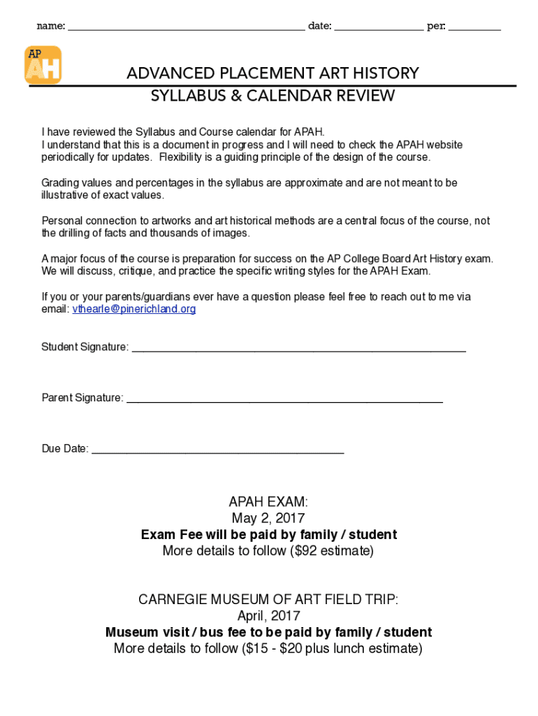 Name: ___ date: ___ per: ___ADVANCED PLACEMENT ART HISTORY SYLLABUS & CALENDAR REVIEW I have reviewed the Syllabus and Course calendar for APA. I understand that this is a document in progress and