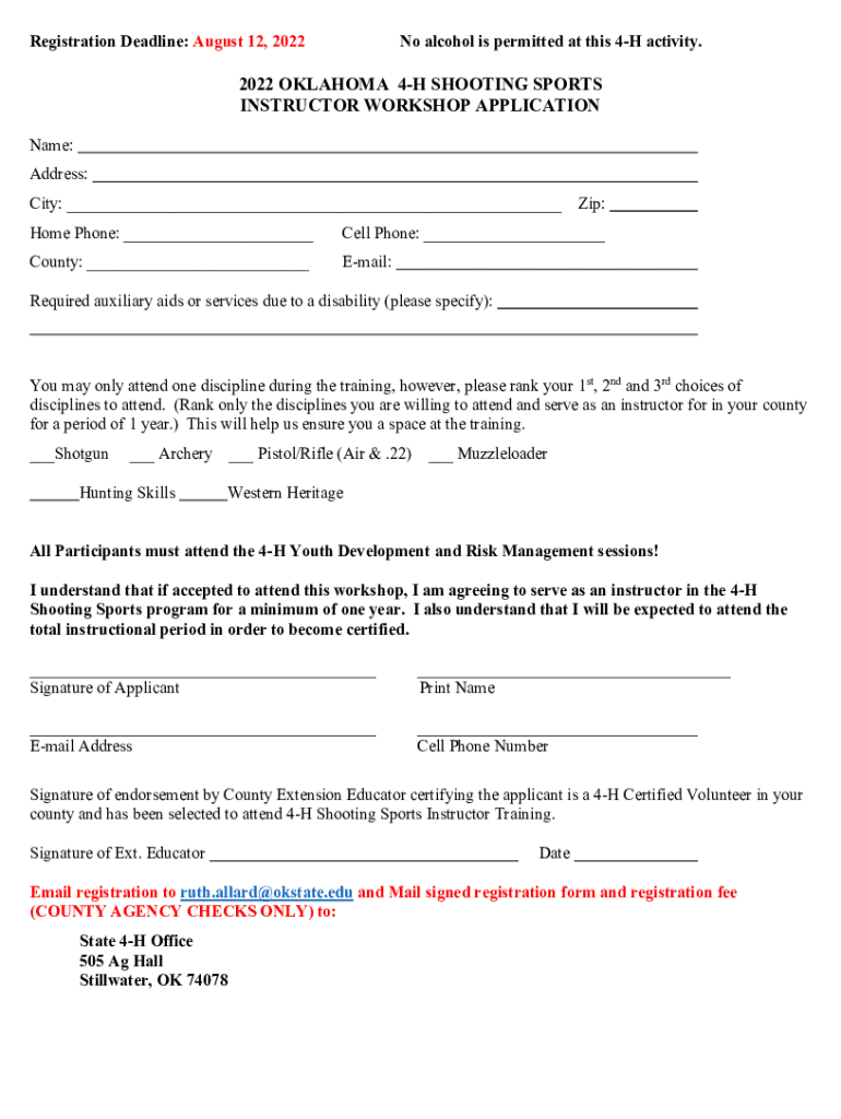 4H Shooting Sports Instructor TrainingCertification Training for 4H Adult Volunteers in the 4H Shooting Sports Program Date:August 2728, 2022Location:OK Gun Club Arcadia, Cost:Registration fee covers