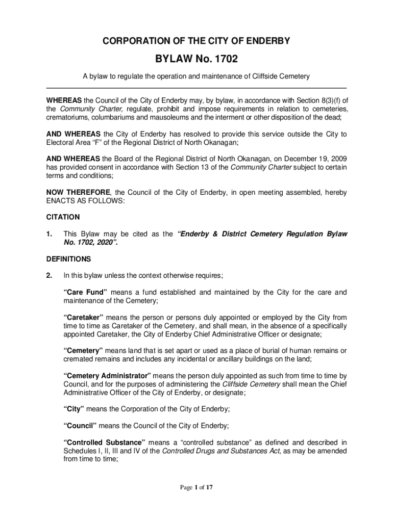 CORPORATION OF THE CITY OF ENDERBYBYLAW No. 1702