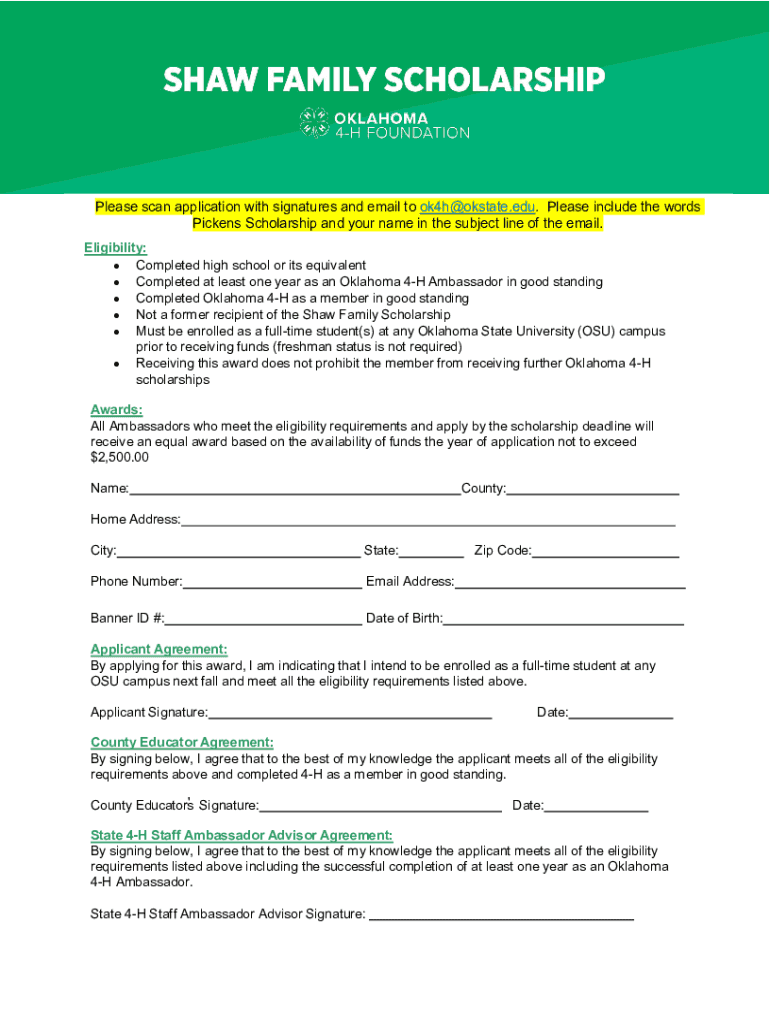 Any student or member of Oklahoma 4-H who wishes to apply for scholarships is required to file the shaw-scholarship-application-formpdf.