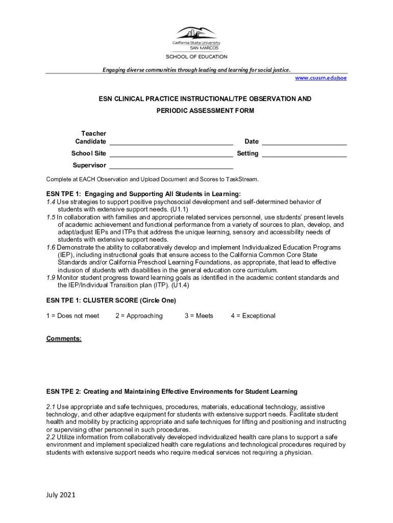 Get the free ESN Instructional Observation and TPE Assessment Form