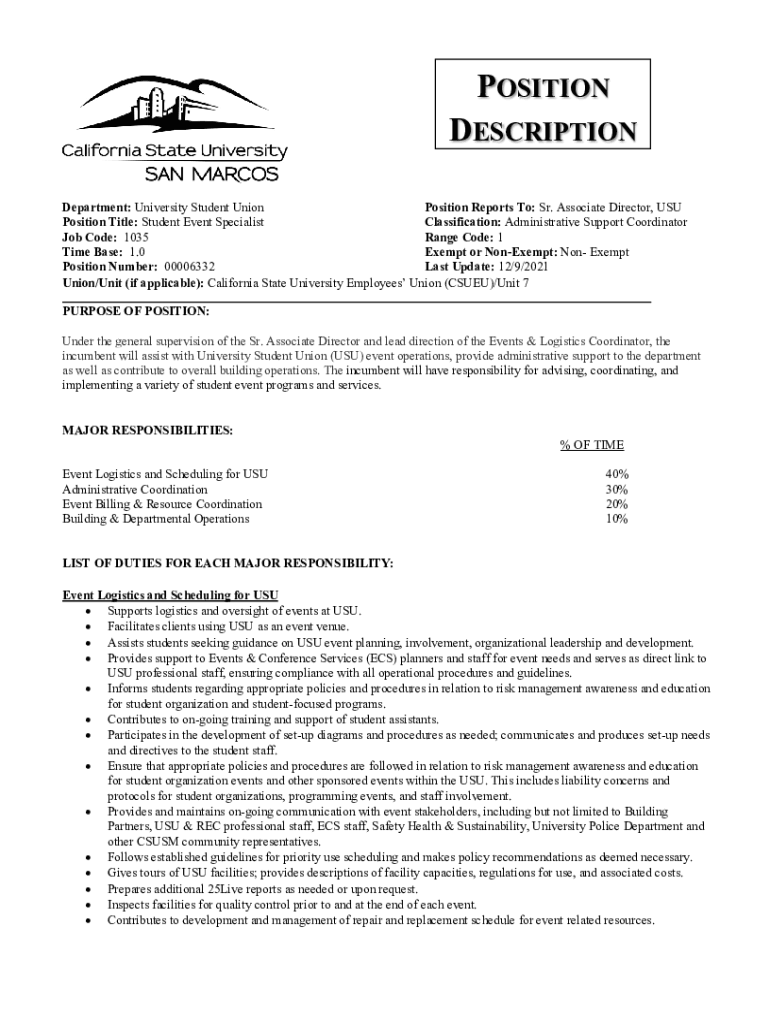 POSITIONDESCRIPTION Department: University Student Union Position Reports To: Sr. Associate Director, USU Position Title: Student Event Specialist Classification: Administrative Support Coordinator
