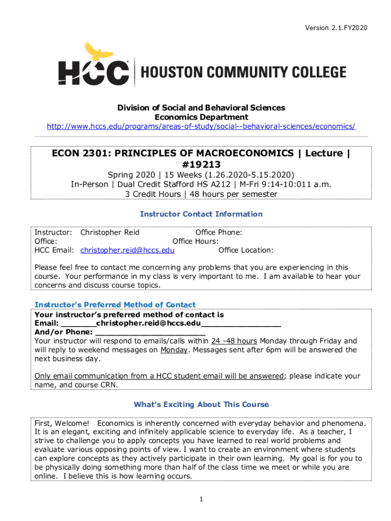 Version 2.1.FY2020Division of Social and Behavioral Sciences Economics Departmenthttp://www.hccs.edu/programs/areasofstudy/socialbehavioralsciences/economics/ECON 2301: PRINCIPLES OF MACROECONOMICS
