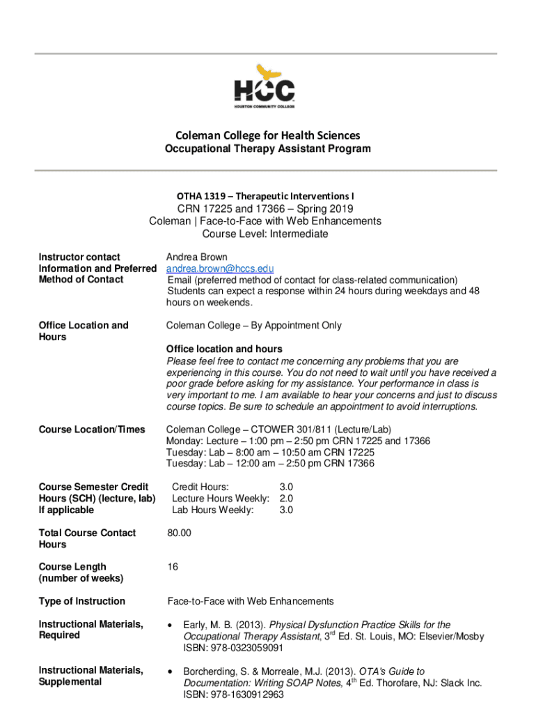 Coleman College for Health Sciences Occupational Therapy Assistant ProgramOTHA 1319 Therapeutic Interventions I CRN 17225 and 17366 Spring 2019 Coleman | FacetoFace with Web Enhancements Course Level: