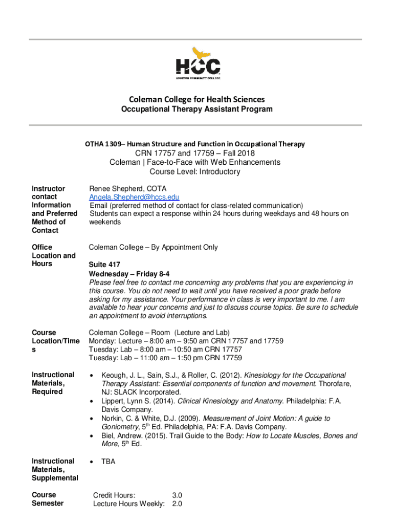 Coleman College for Health Sciences Occupational Therapy Assistant ProgramOTHA 1309 Human Structure and Function in Occupational Therapy CRN 17757 and 17759 Fall 2018 Coleman | FacetoFace with Web