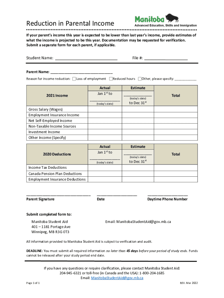Reduction in Parental Income If your parents income this year is expected to be lower than last year's income, provide estimates of what the income is projected to be this year. Documentation may