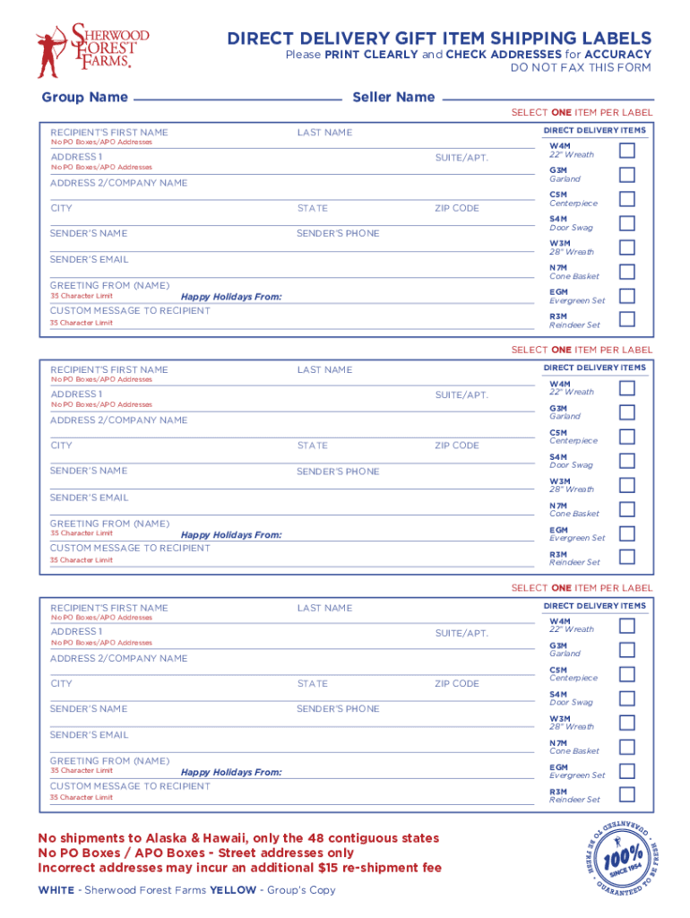 DIRECT DELIVERY GIFT ITEM SHIPPING LABELSPlease PRINT CLEARLY and CHECK ADDRESSES for ACCURACY