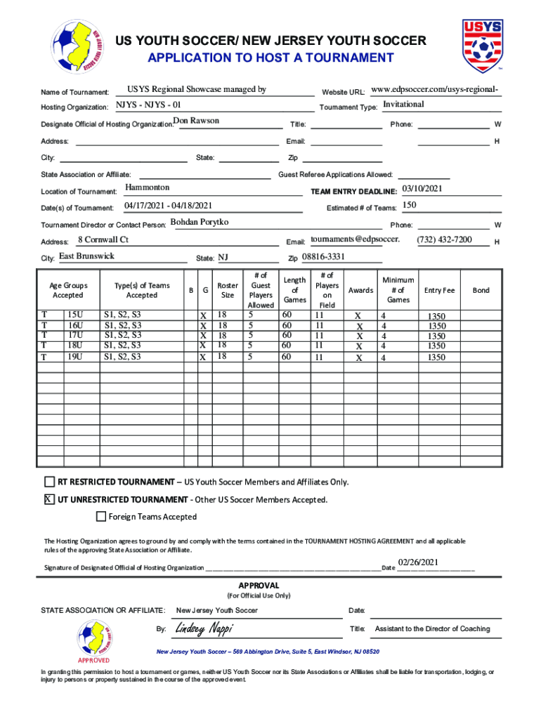US YOUTH SOCCER/ NEW JERSEY YOUTH SOCCER APPLICATION TO HOST A TOURNAMENT USES Regional Showcase managed became of Tournament:Website URL:NAYS 01Hosting Organization:Designate Official of Hosting