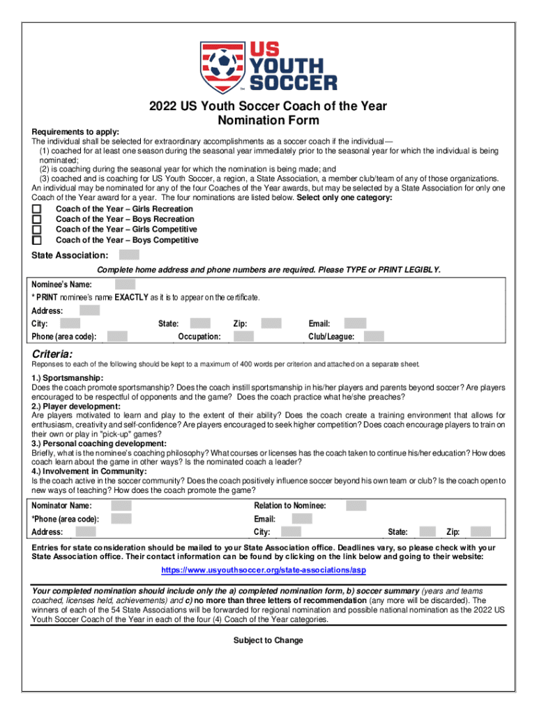 2022 US Youth Soccer Coach of the Year Nomination Form Requirements to apply: The individual shall be selected for extraordinary accomplishments as a soccer coach if the individual (1) coached for