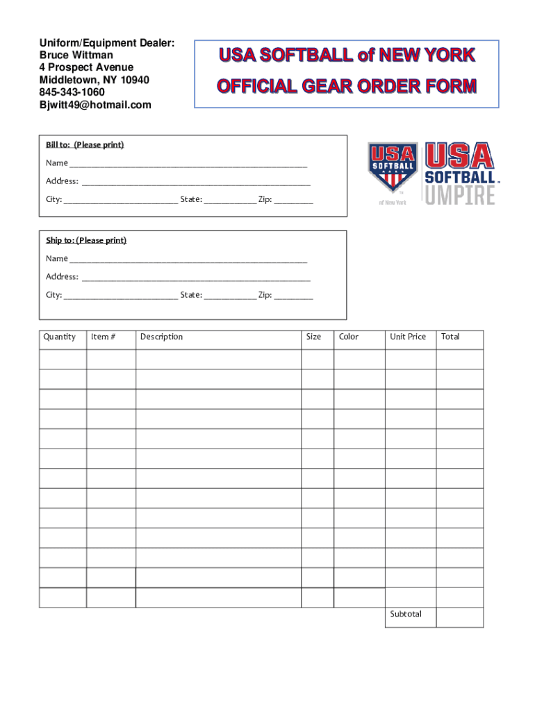 Uniform/Equipment Dealer: Bruce Pittman 4 Prospect Avenue Middletown, NY 10940 8453431060 Bjwitt49@hotmail.comBill to: (Please print) Name ___ Address: ___ City: ___ State: ___ Zip: ___Ship to: (Please