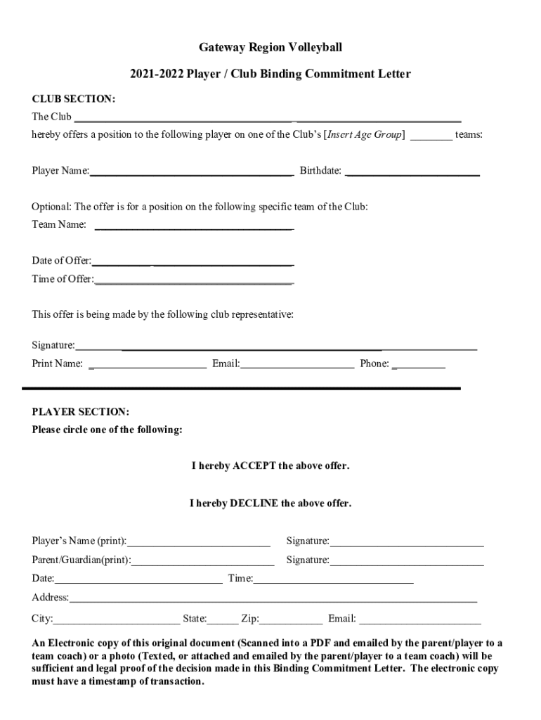(copy as 2sided, one-page form)Gateway Region Volleyball20212022 Binding Commitment Letter 1. A. Offer Period for All Boys age Divisions. If I try out and receive an offer for a Boys club team, I