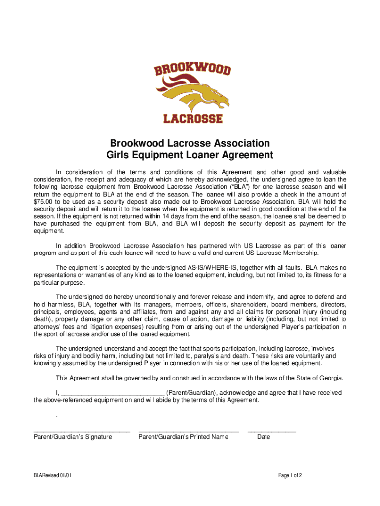 Get the free Brookwood Lacrosse Association Girls Equipment Loaner Agreement