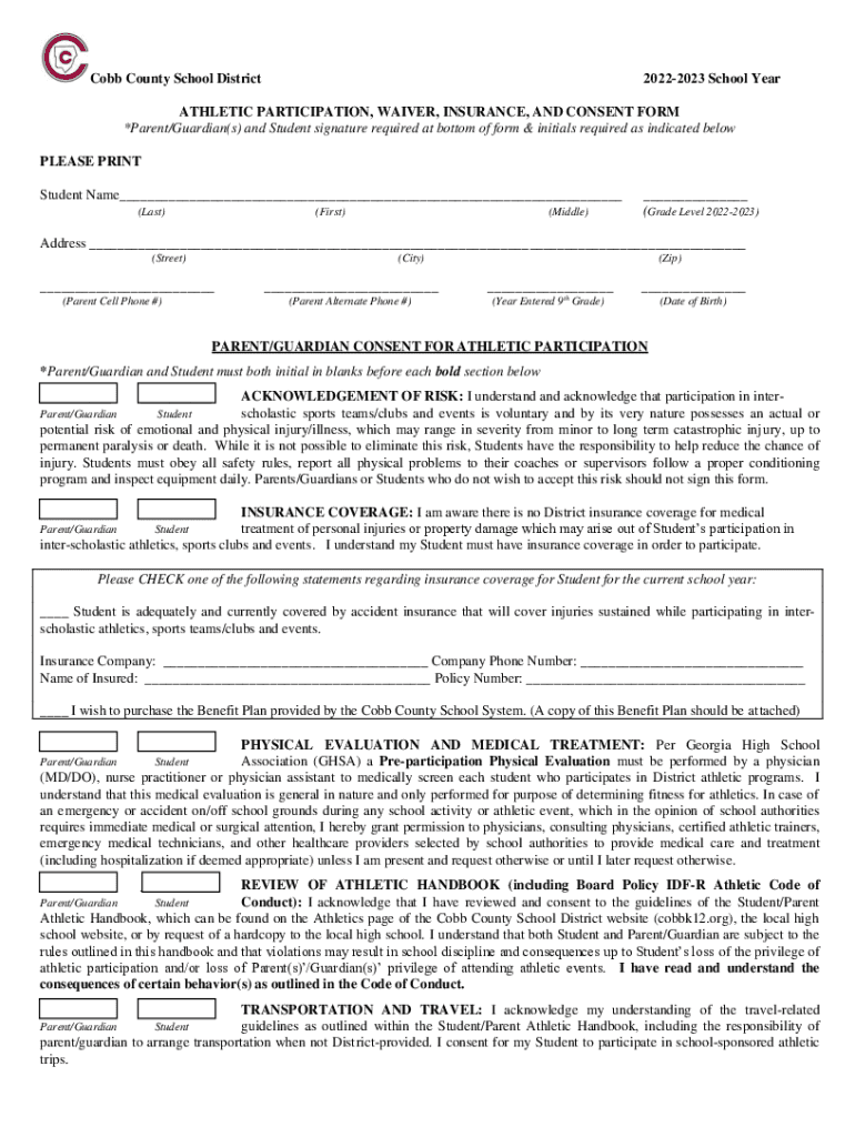 Cobb County School District20222023 School Parenthetic PARTICIPATION, WAIVER, INSURANCE, AND CONSENT FORM *Parent/Guardian(s) and Student signature required at bottom of form & initials required as