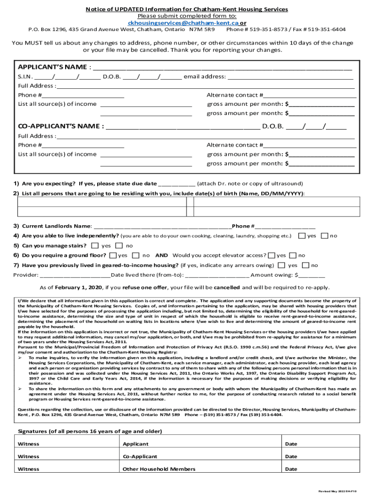 Notice of UPDATED Information for ChathamKent Housing Services Please submit completed form to: ckhousingservices@chathamkent.ca ORP. O. Box 1296, 435 Grand Avenue West, Chatham, Ontario N7M 5R9Phone