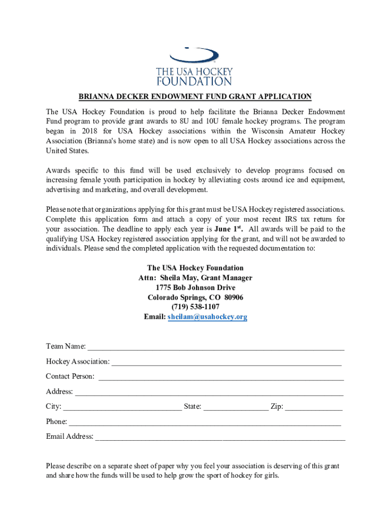 BRIANNA DECKER ENDOWMENT FUND GRANT APPLICATION The USA Hockey Foundation is proud to help facilitate the Brianna Decker Endowment Fund program to provide grant awards to 8U and 10U female hockey