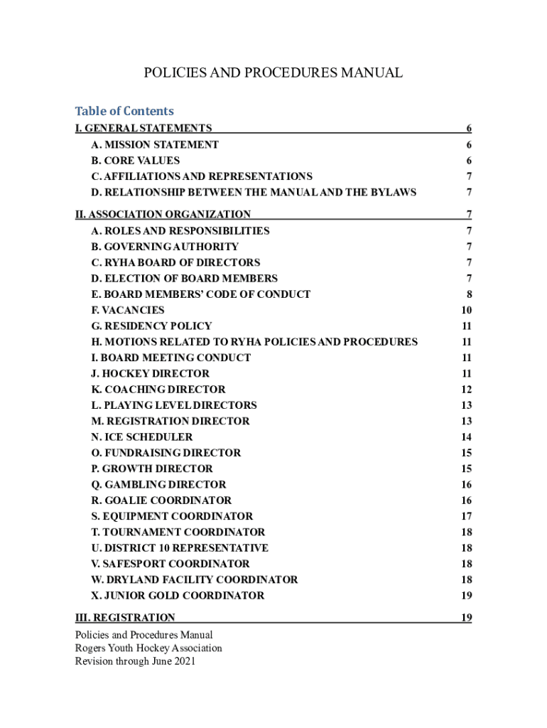 POLICIES AND PROCEDURES MANUAL Table of Contents I. GENERAL STATEMENTS A. MISSION STATEMENT B. CORE VALUES C. AFFILIATIONS AND REPRESENTATIONS D. RELATIONSHIP BETWEEN THE MANUAL AND THE BYLAWS6 6