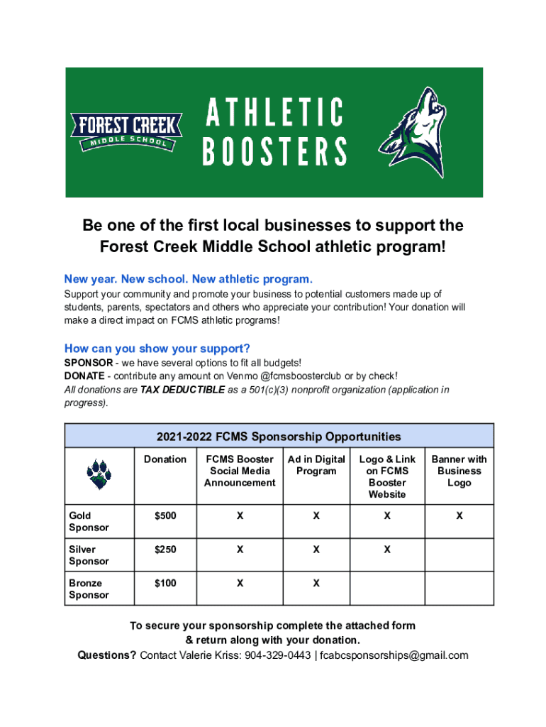 Be one of the first local businesses to support the Forest Creek Middle School athletic program! New year. New school. New athletic program. Support your community and promote your business to potential