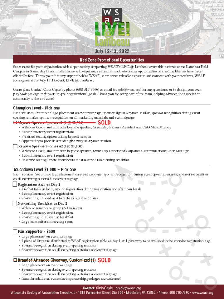 Plateau July 1213, 2022Red Zone Promotional Opportunities Score more for your organization with a sponsorship supporting WSA Es LIVE @ Lam beau event this summer at the Lambeau Field Campus in Green
