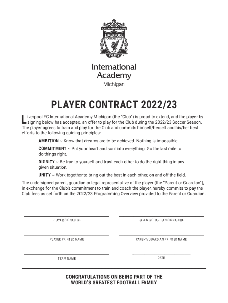 PLAYER CONTRACT 2022/23Liverpool FC International Academy Michigan (the Club) is proud to extend, and the player by signing below has accepted, an offer to play for the Club during the 2022/23 Soccer