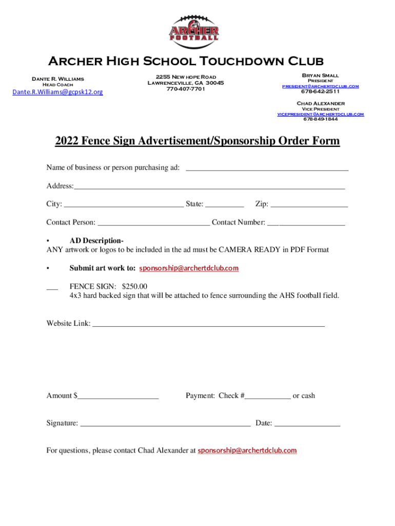 Archer High School Touchdown Club Dante R. Williams Head Coach Dante.R.Williams@gcpsk12.org2255 New hope Road Lawrenceville, GA 30045 7704077701Bryan Small President president@archertdclub.com6786422511
