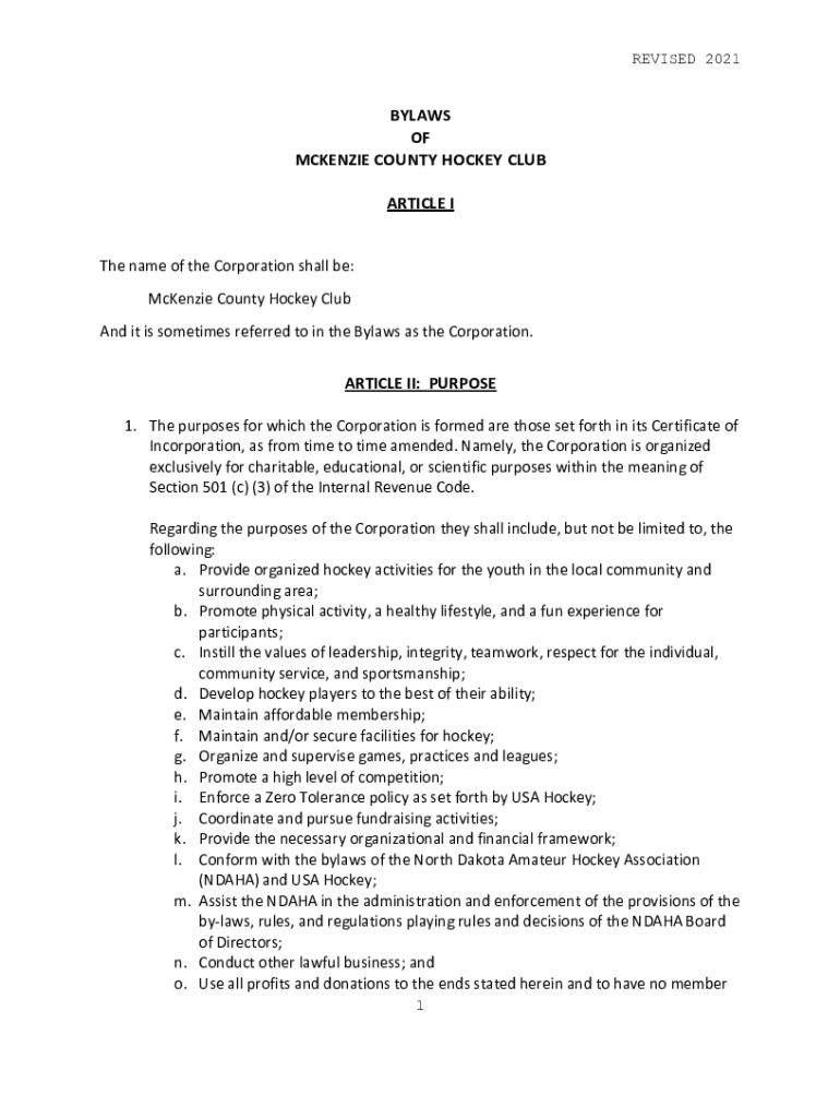 REVISED 2021BYLAWS OF MCKENZIECOUNTYHOCKEYCLUB ARTICLE ThenameoftheCorporationshallbe: McKenzieCountyHockeyClubAnditissometimesreferredtointheBylawsastheCorporation. ARTICLE:PURPOSE 1. ThepurposesforwhichtheCorporationisformedarethosesetforthinitsCertificateof