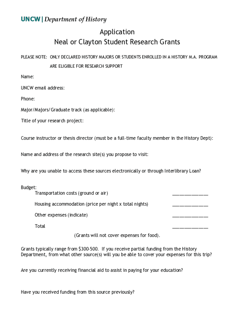 UNC|Department of HistoryApplication Neal or Clayton Student Research Grants PLEASE NOTE: ONLY DECLARED HISTORY MAJORS OR STUDENTS ENROLLED IN A HISTORY M.A. PROGRAM ARE ELIGIBLE FOR RESEARCH Supportive: