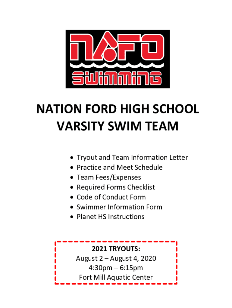 NATION FORD HIGH SCHOOL VARSITY SWIM TEAM Tryout and Team Information Letter Practice and Meet Schedule Team Fees/Expenses Required Forms Checklist Code of Conduct Form Swimmer Information Form Planet