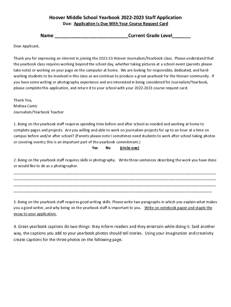 Hoover Middle School Yearbook 20222023 Staff Application Due: Application Is Due With Your Course Request Carnage ___Current Grade Level___ Dear Applicant, Thank you for expressing an interest in