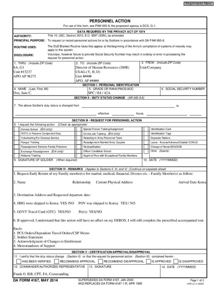 Attachments MenuPERSONNEL ACTION For use of this form, see PAM 6008; the proponent agency is DCS, G1. DATA REQUIRED BY THE PRIVACY ACT OF 1974 Title 10, USC, Section 3013, E.O. 9397 (SSN), as amended