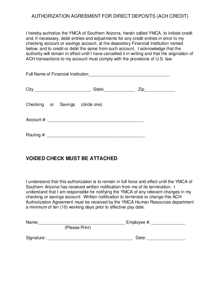 AUTHORIZATION AGREEMENT FOR DIRECT DEPOSITS (ACH CREDIT)I hereby authorize the YMCA of Southern Arizona, herein called YMCA, to initiate credit and, if necessary, debit entries and adjustments for