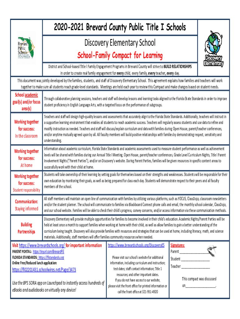 20202021 Brevard County Public Title I SchoolsDiscovery Elementary School SchoolFamily Compact for Learning District and School based Title I Family Engagement Programs in Brevard County will strive