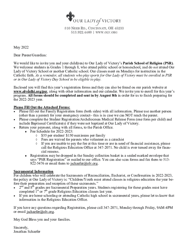 810 NEE BRD., CINCINNATI, OH 45233 513.922.4460 | WWW.OLD.ORG May 2022 Dear Parent/Guardian:We would like to invite you and your child(men) to Our Lady of Victory's Parish School of Religion (PSR).
